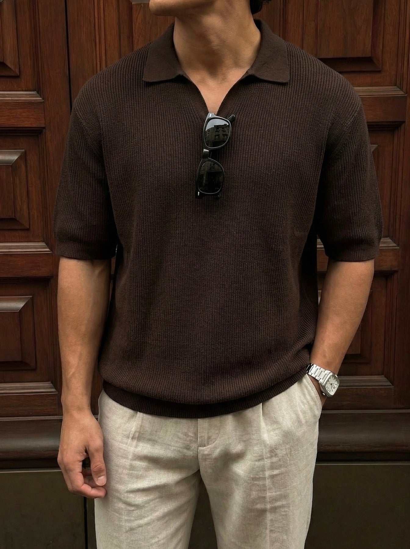 Loose fit fine knit collar T-Shirt - Dark Brown