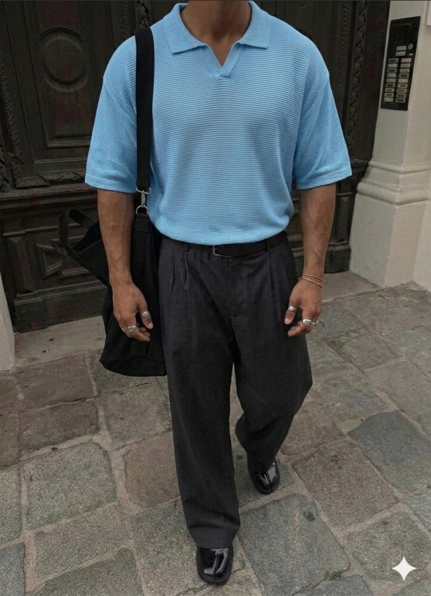 Oversize Collar Ribbed Knit T-Shirt - Babyblue