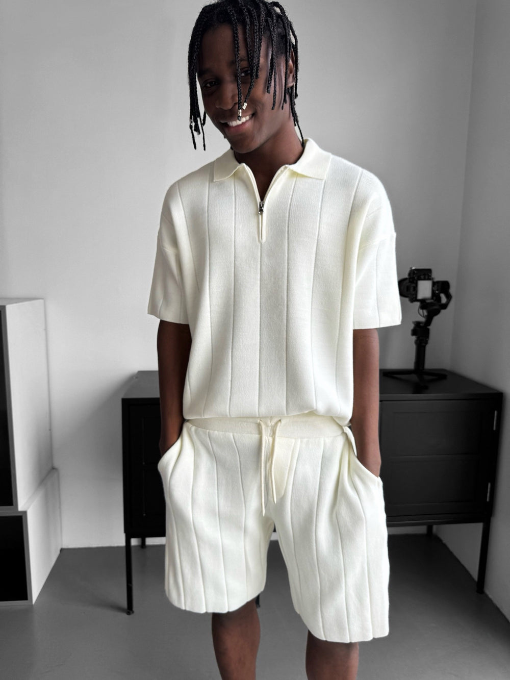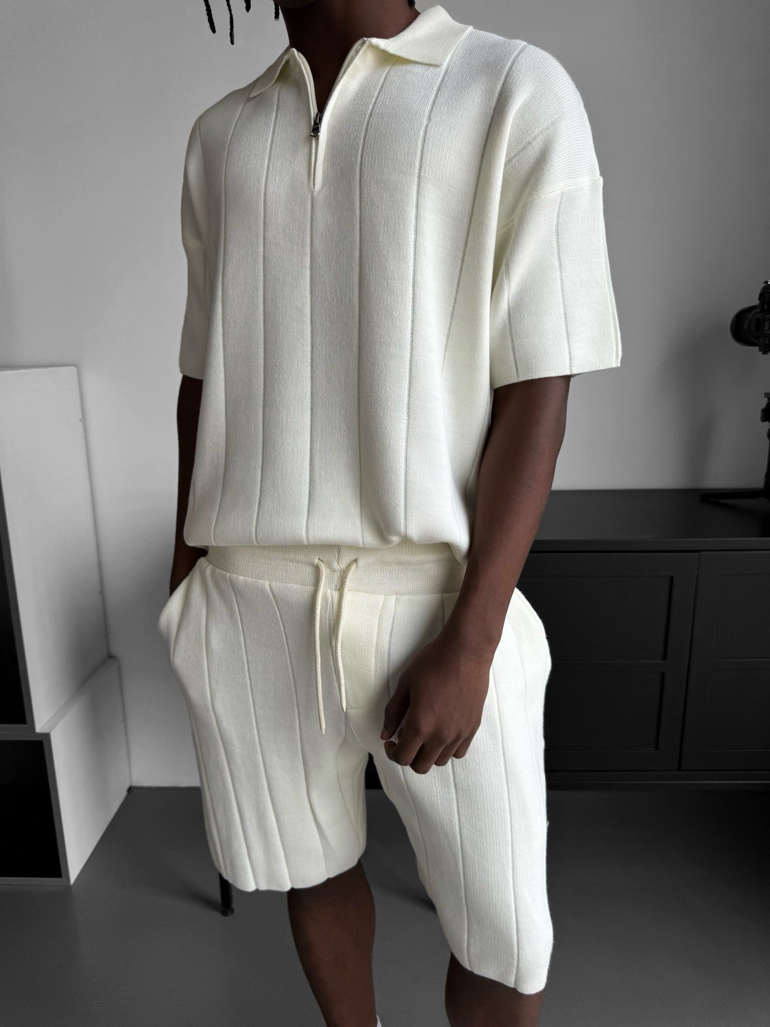 Loose Fit Line Collar Knit T-Shirt - Ecru
