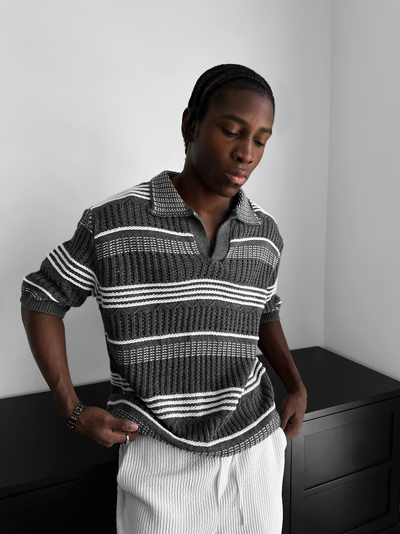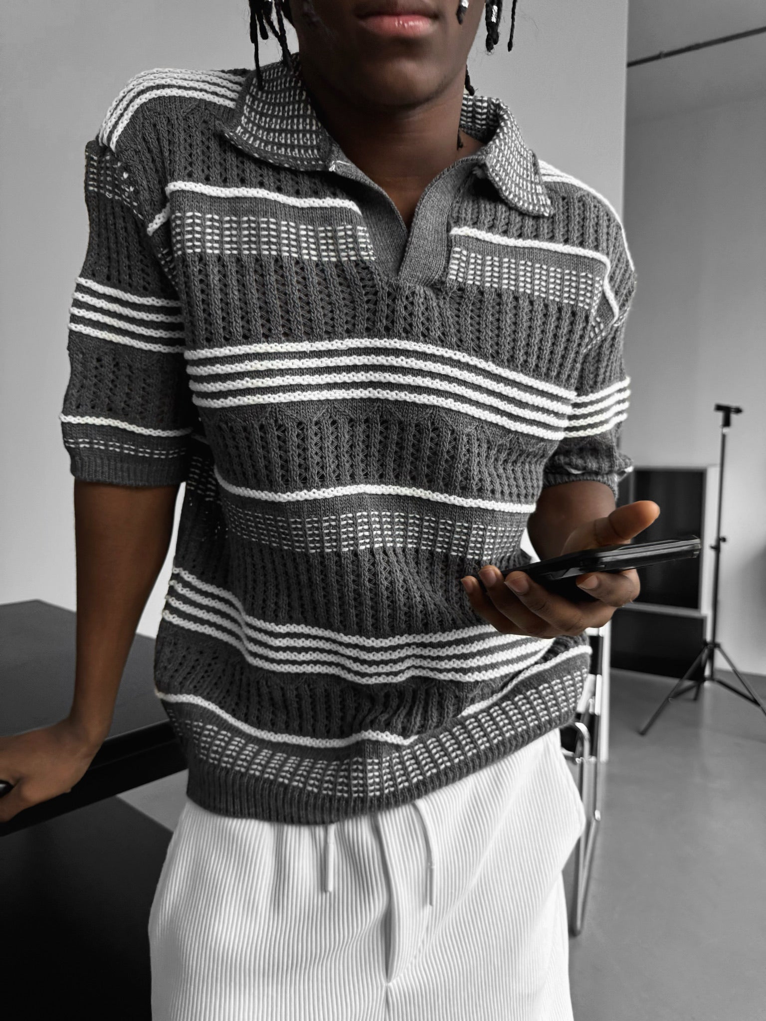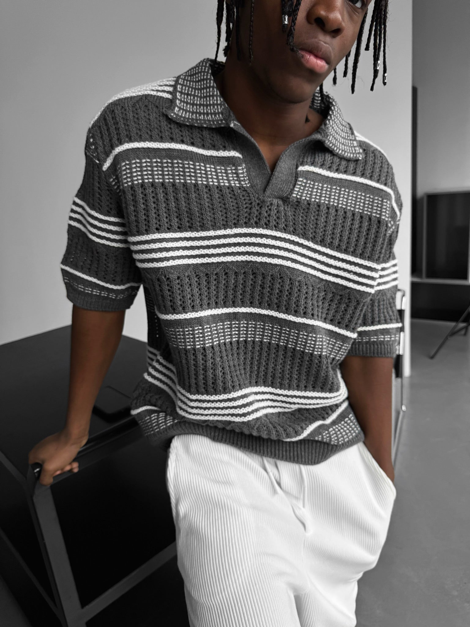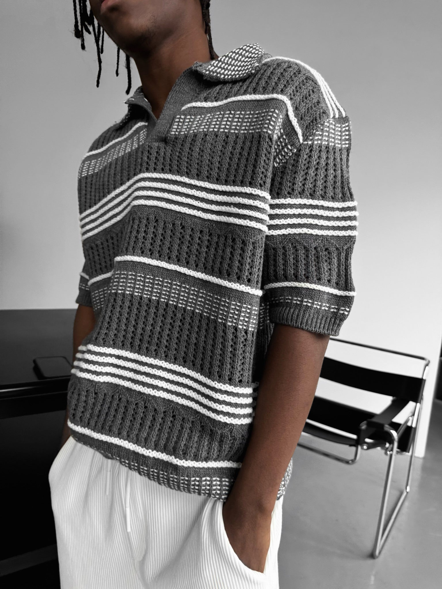 Loose Fit Patterned collar knit T-Shirt - Anthracite