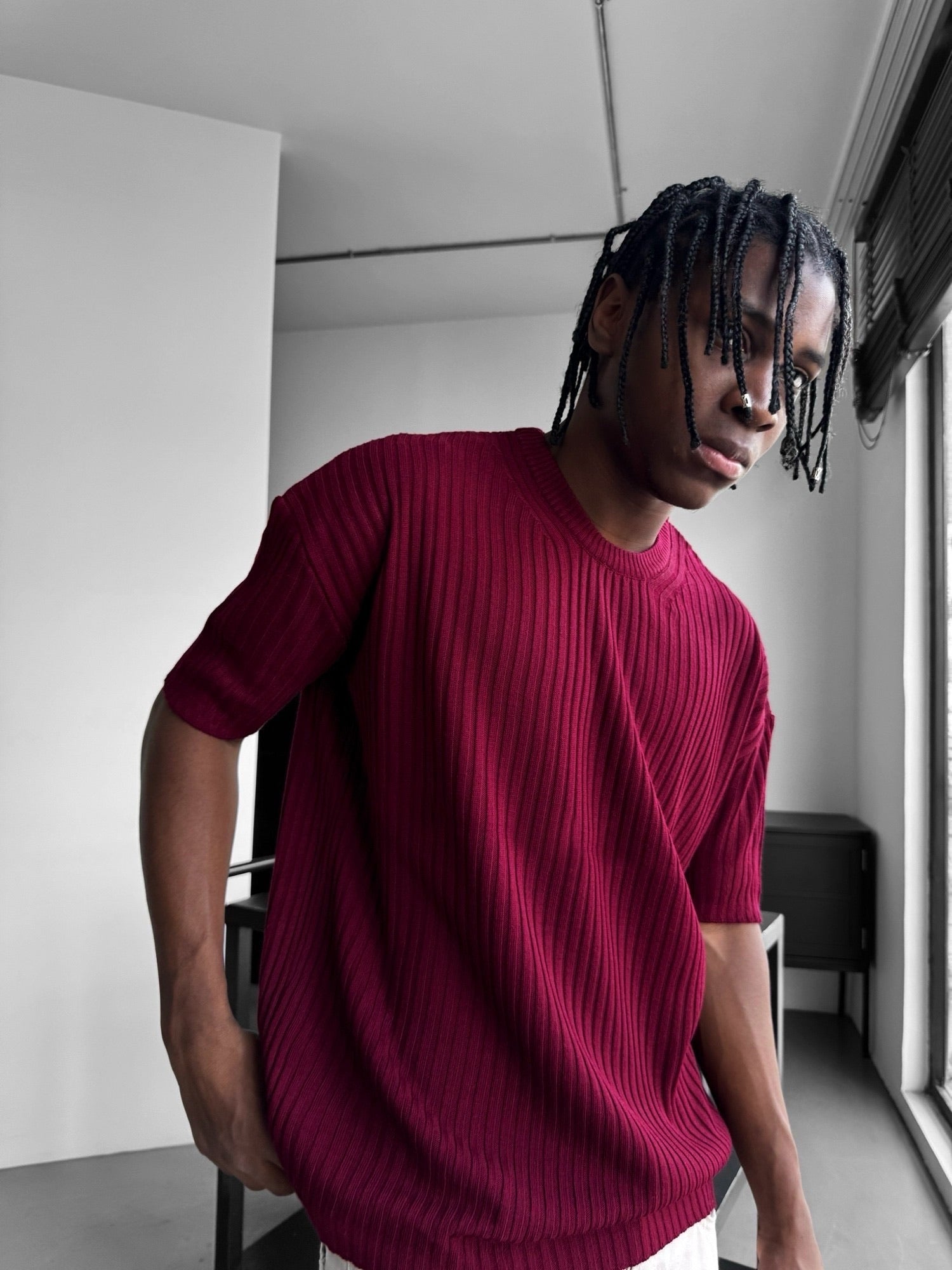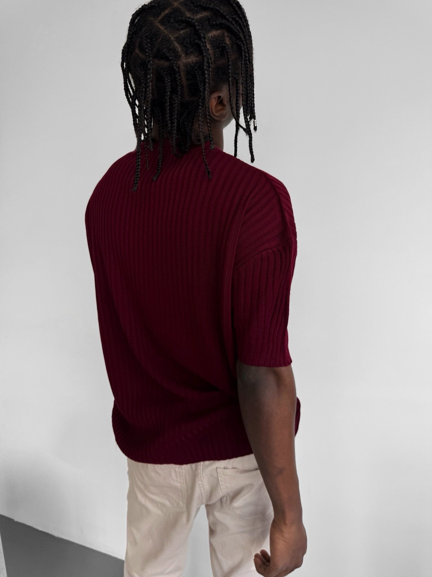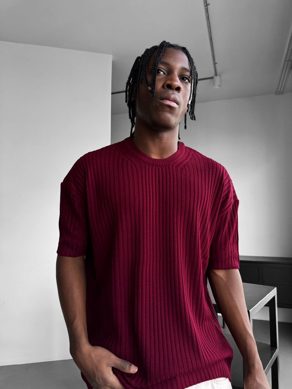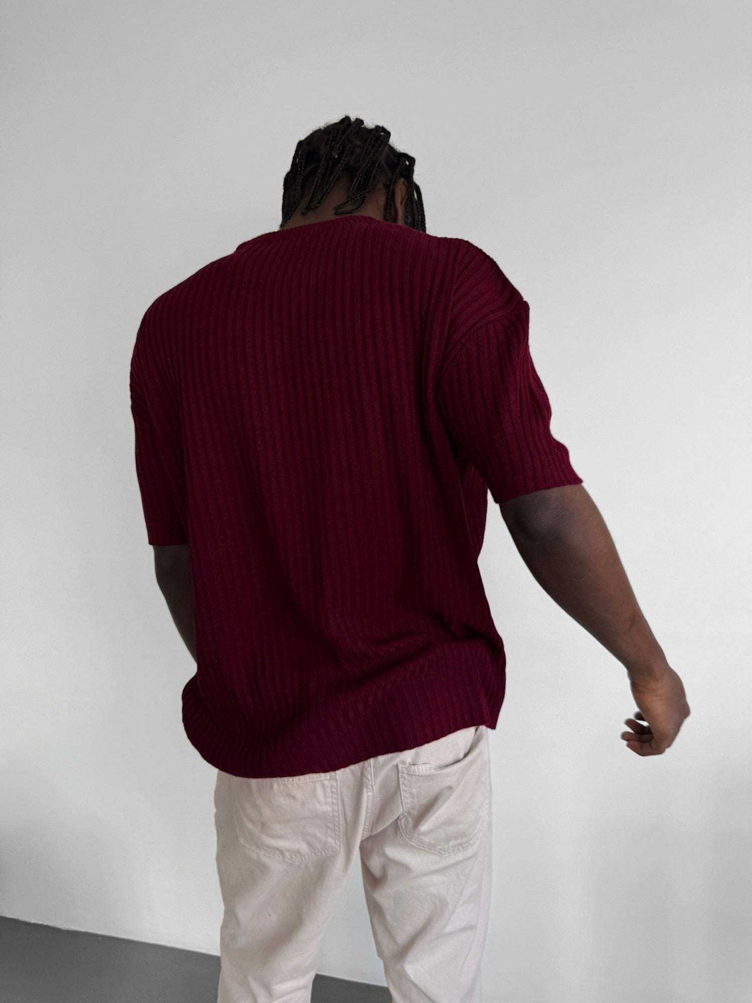 Loose Fit Ribbed Knit T-Shirt - Bordeaux