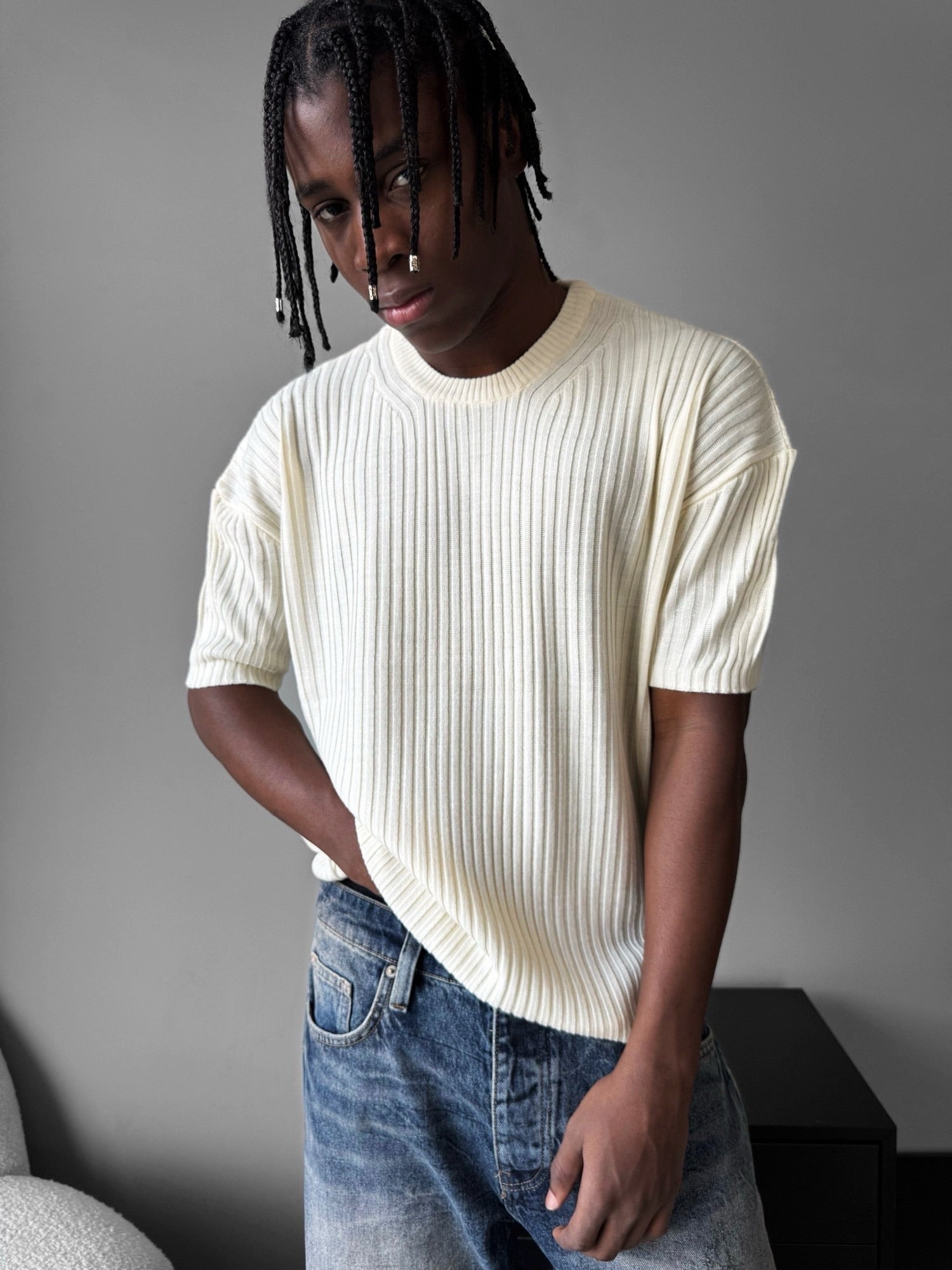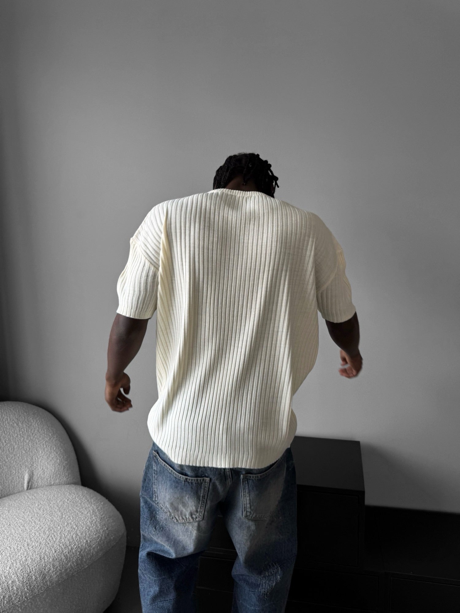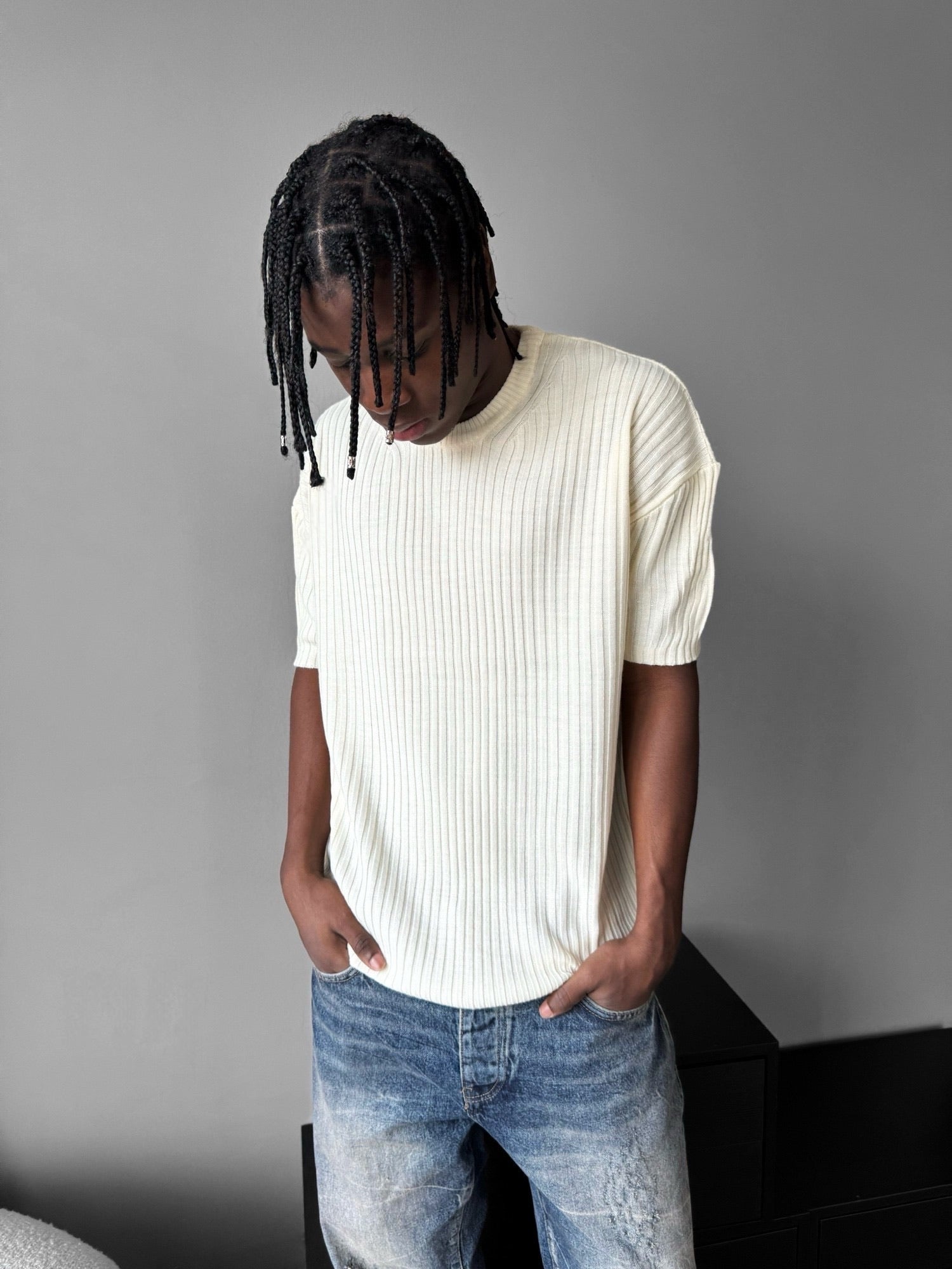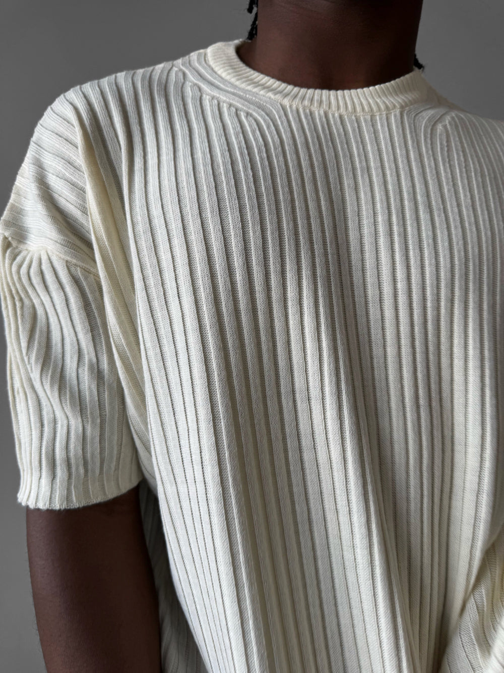 Loose Fit Ribbed Knit T-Shirt - Cremé
