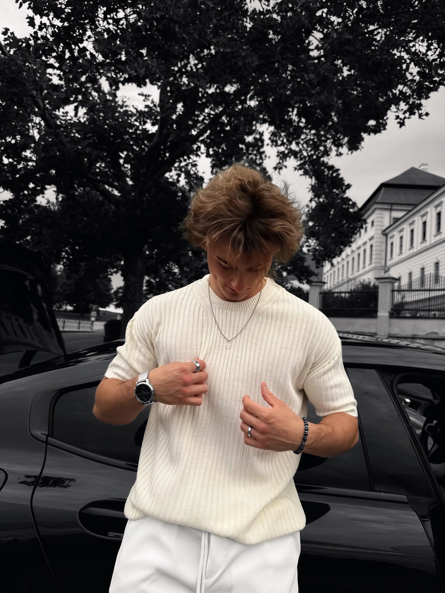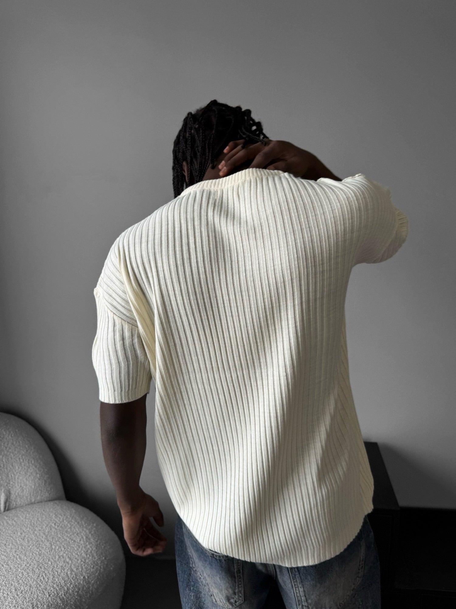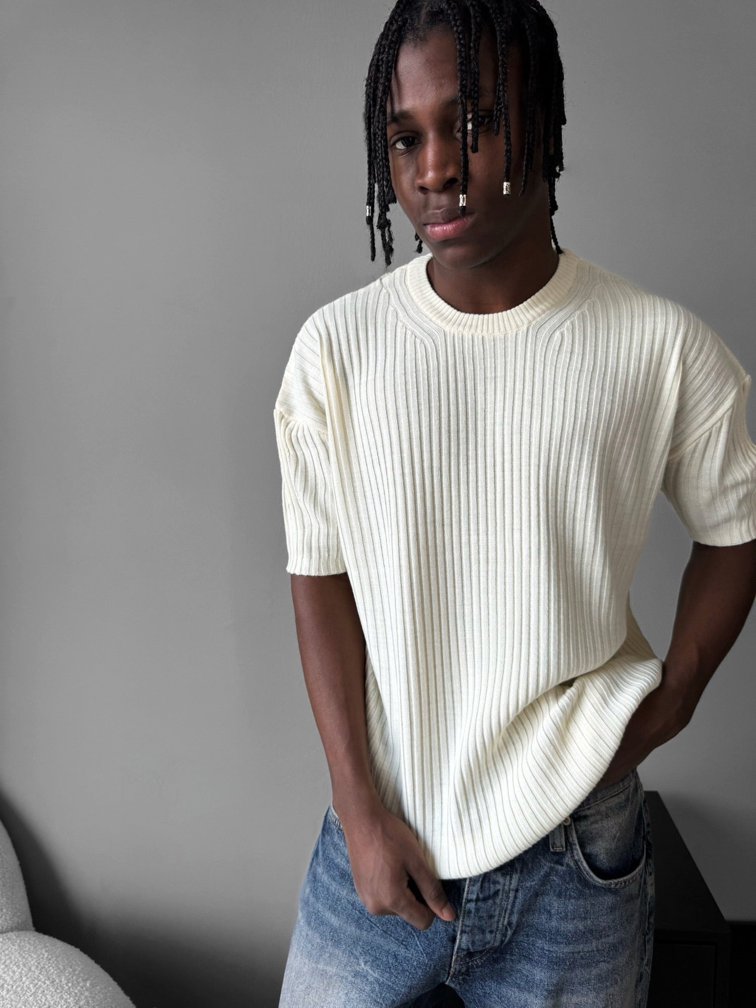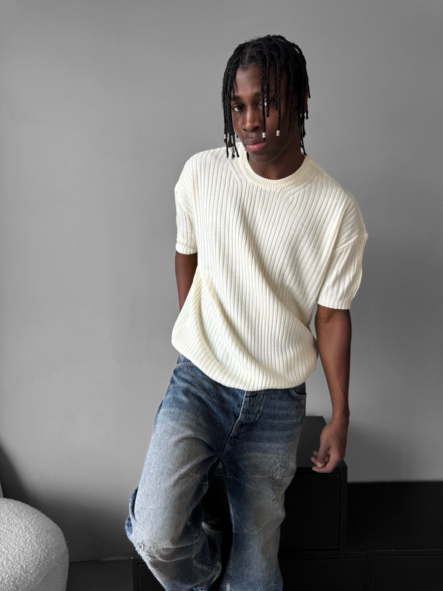 Loose Fit Ribbed Knit T-Shirt - Cremé
