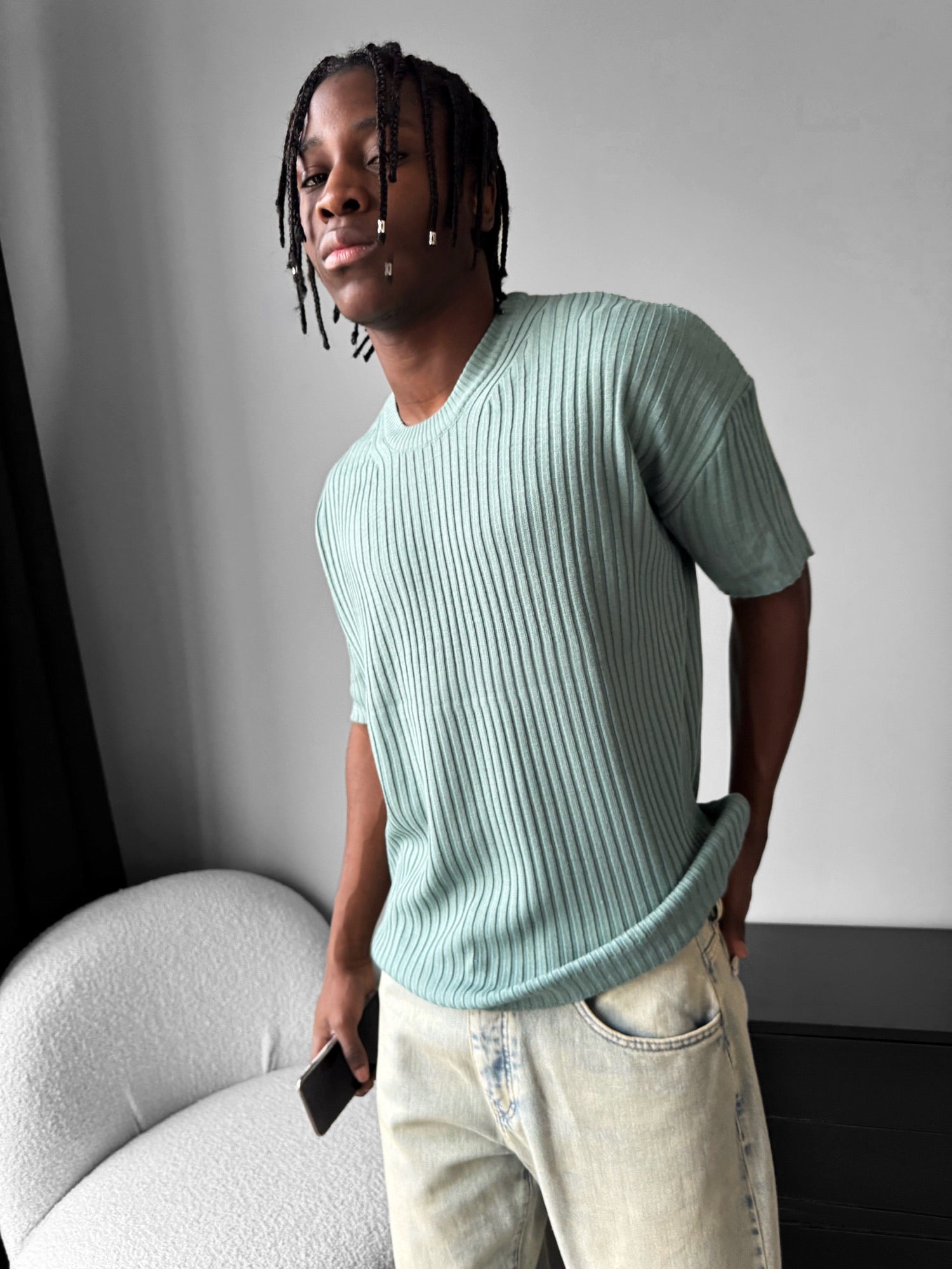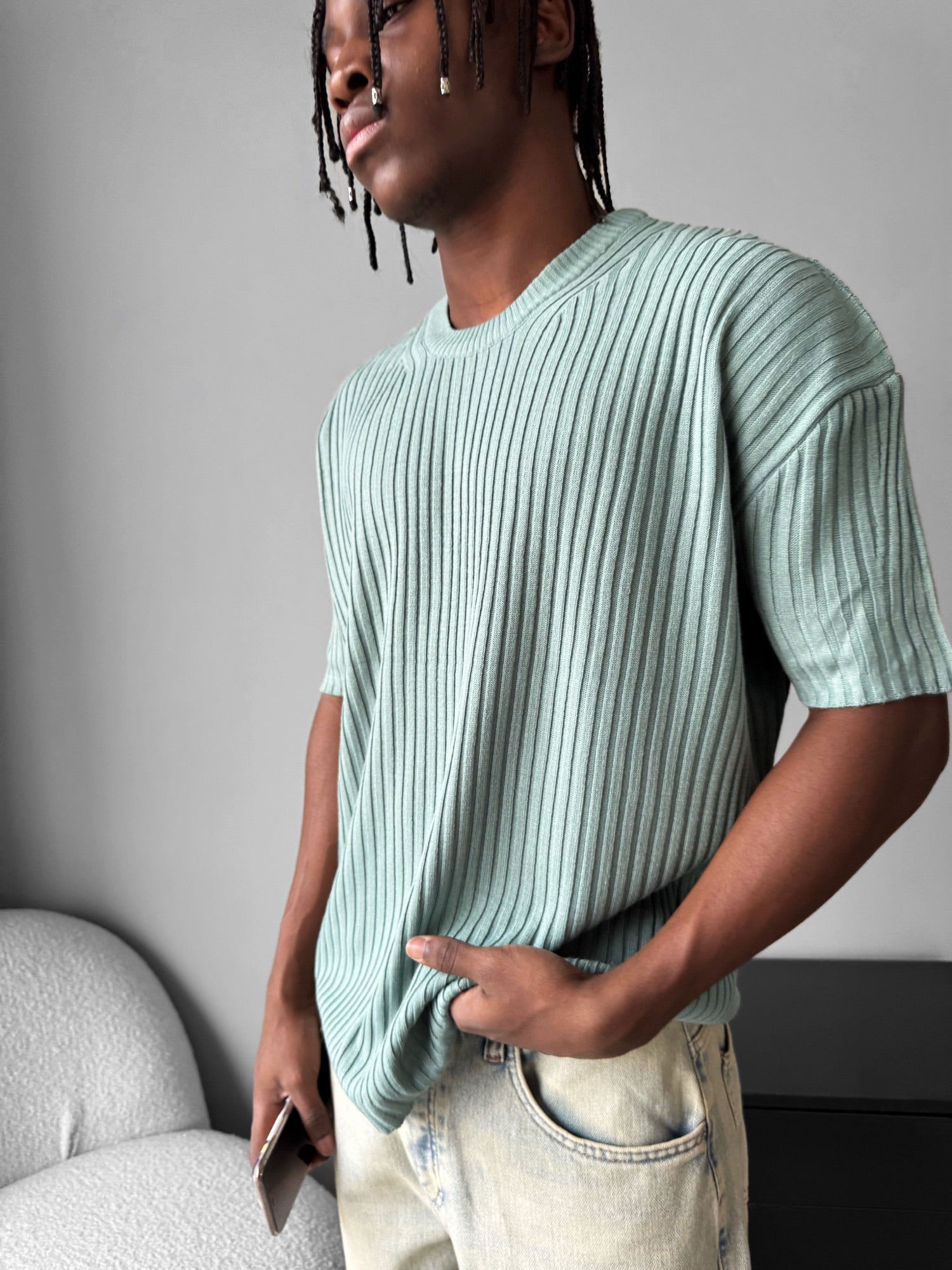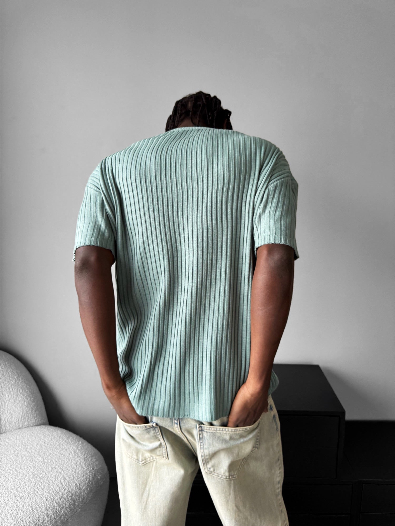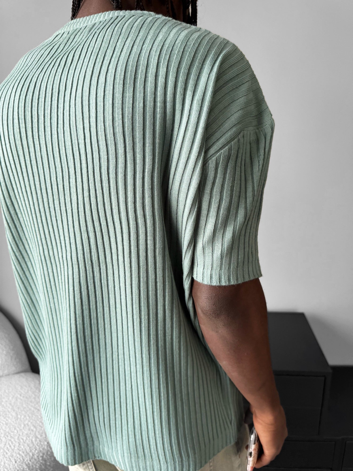 Loose Fit Ribbed Knit T-Shirt - Mint