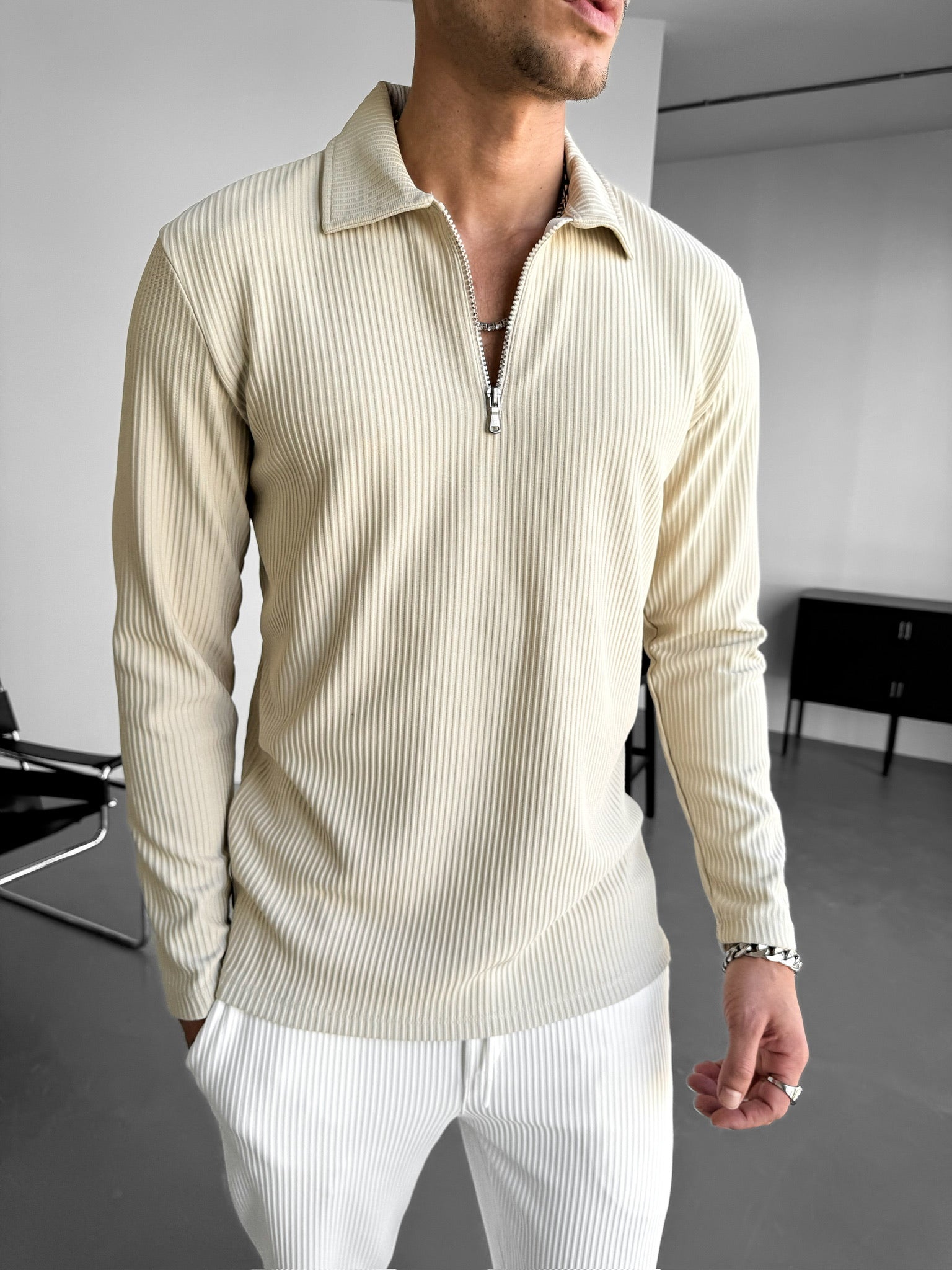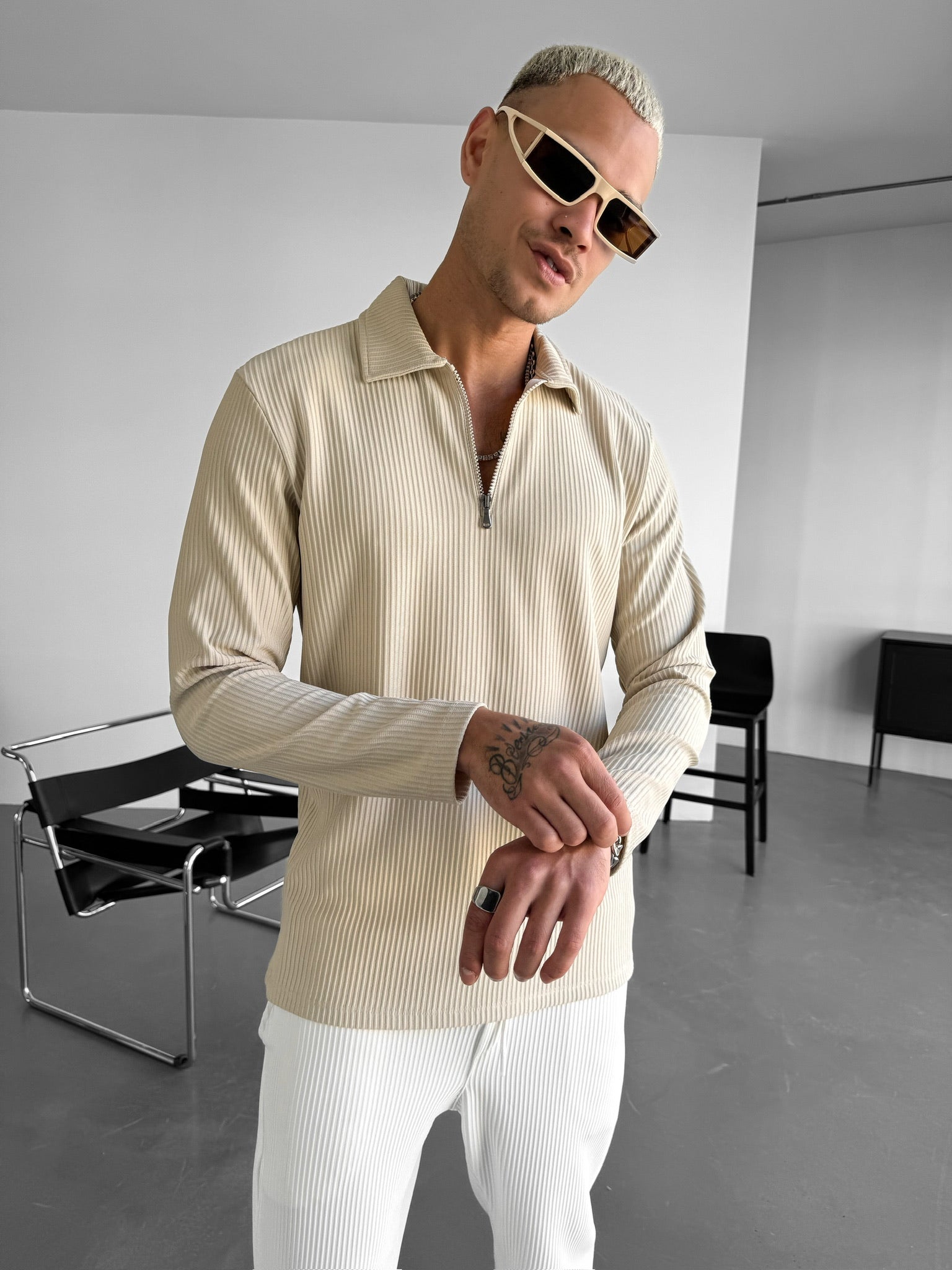 Loose Fit Zipper Polo Sweatshirt - Beige