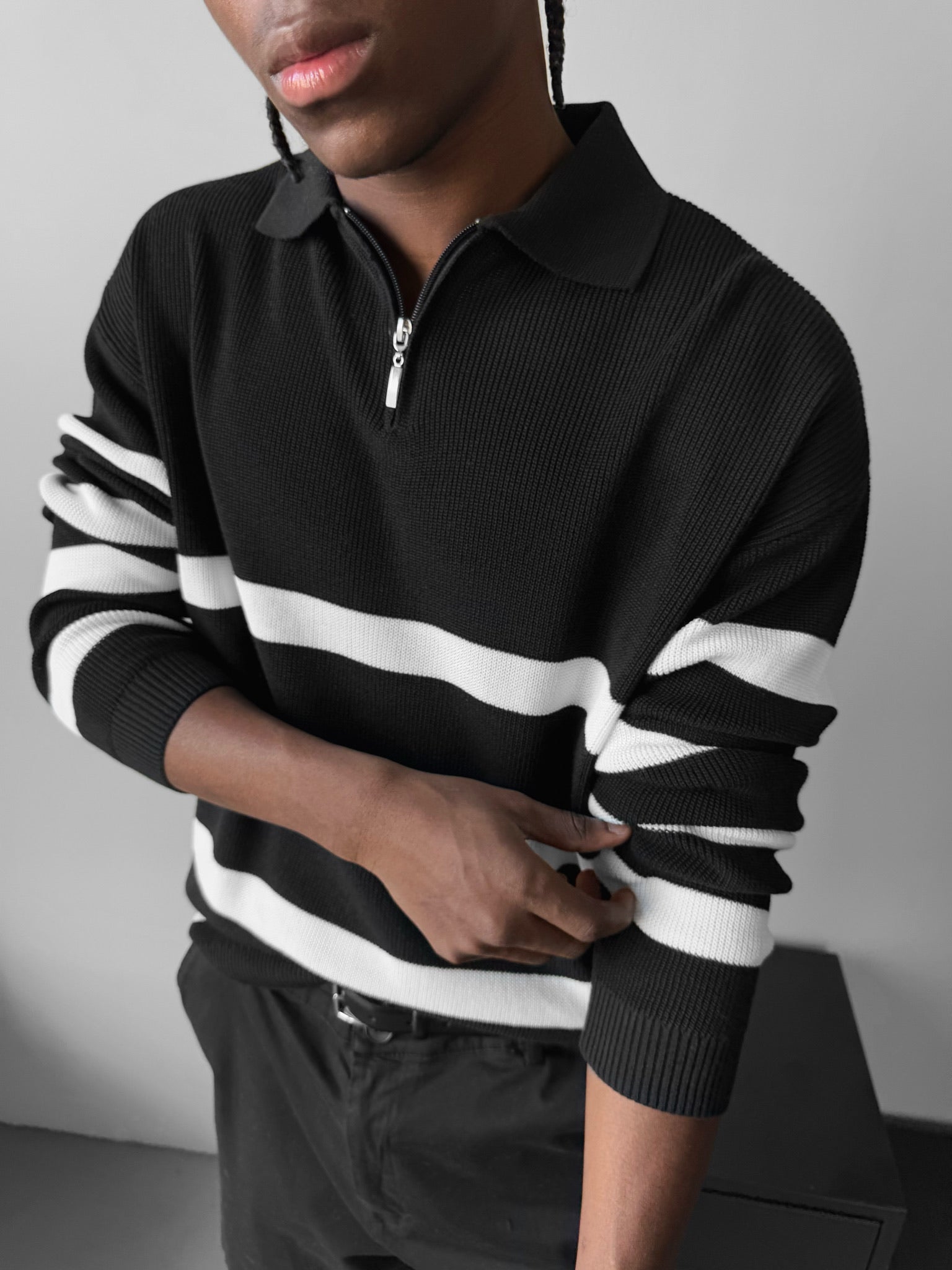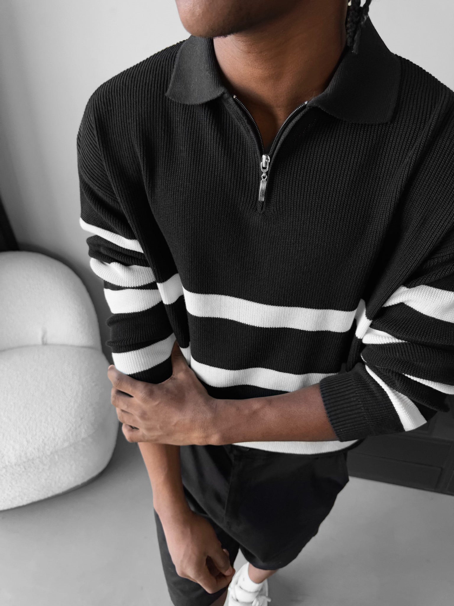 Oversize Knit Crop Polo Sweater - Black