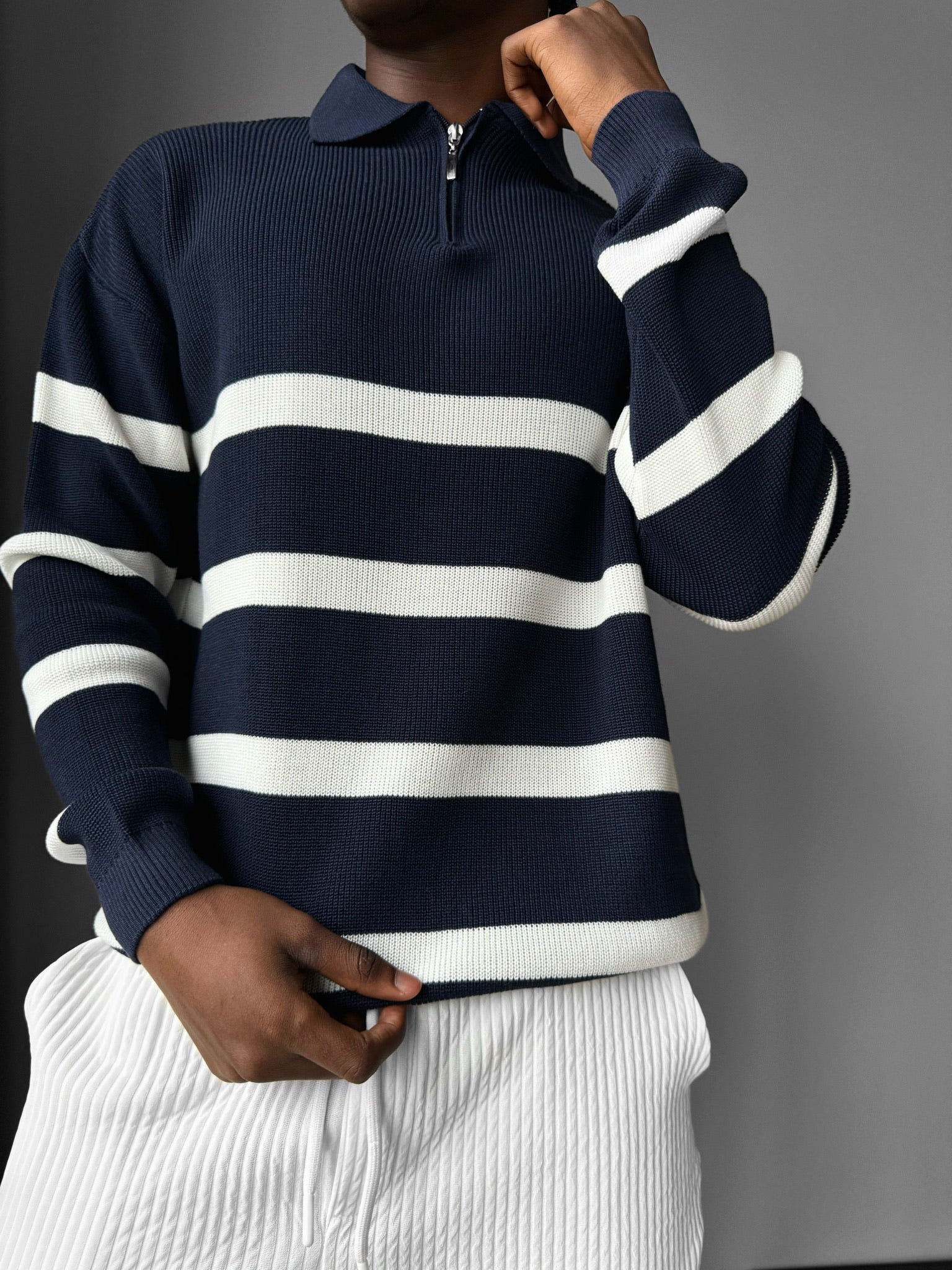 Oversize Knit Crop Polo Sweater - Dark Blue