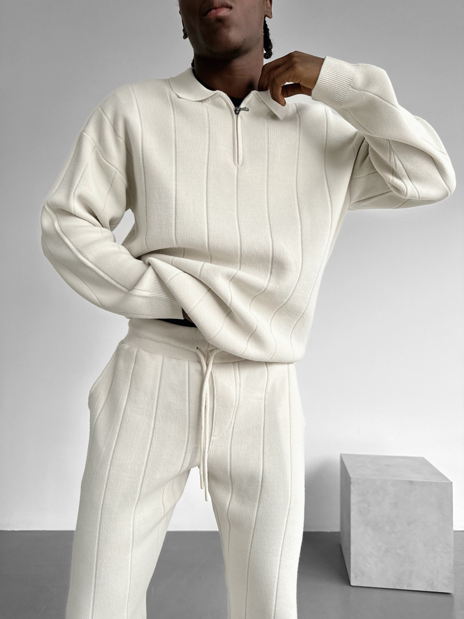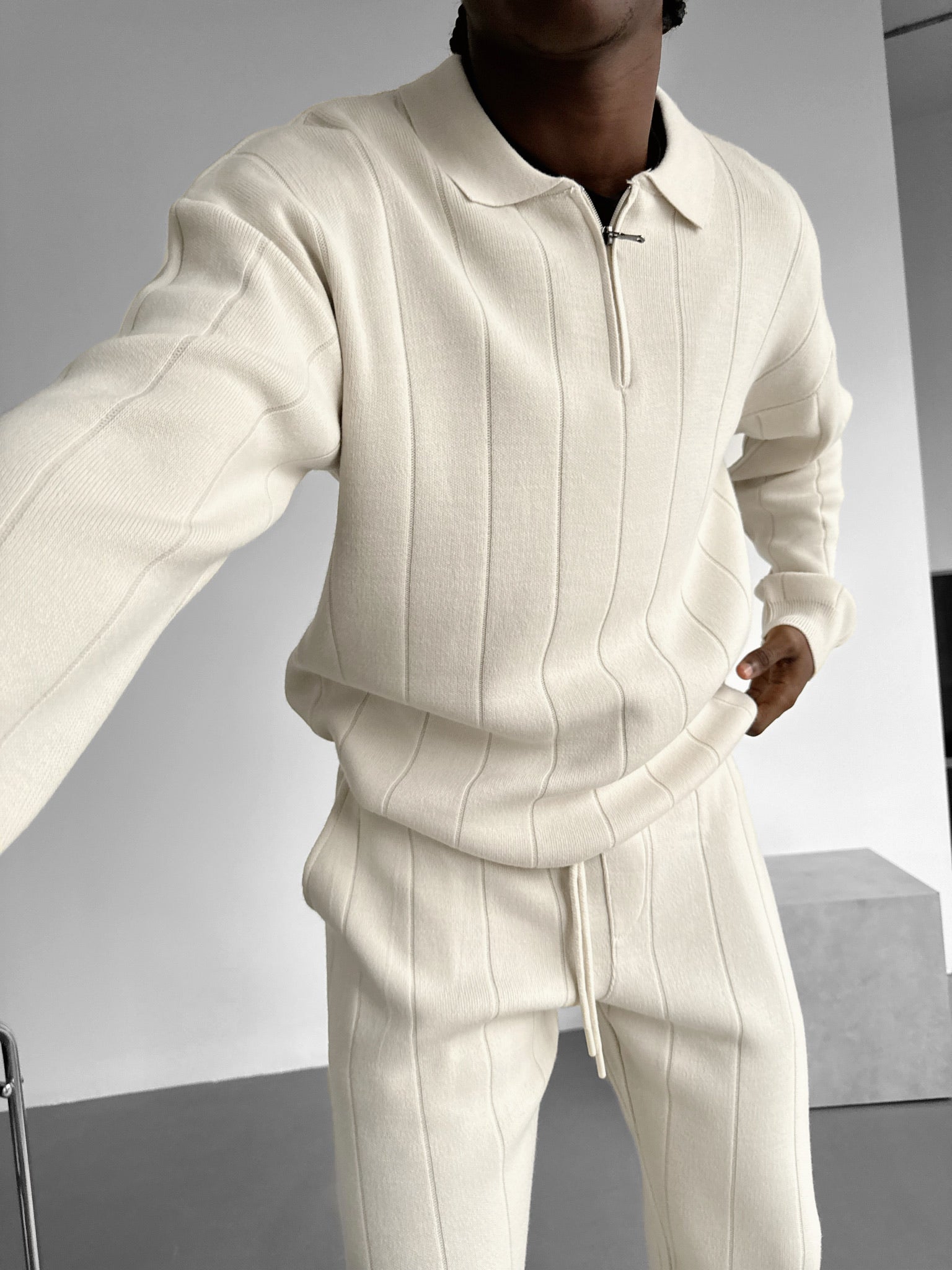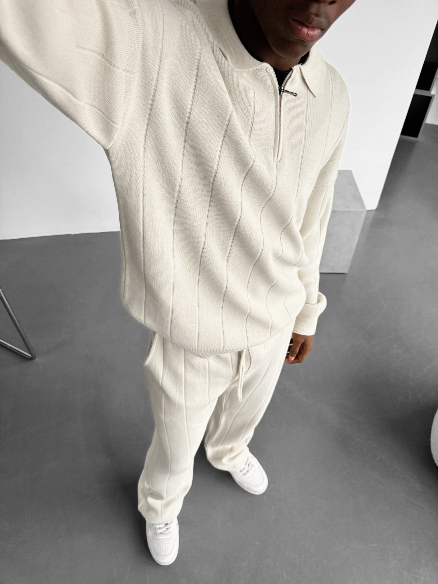 Oversize Lines Knit Zipper Polo Sweatshirt - Ecru