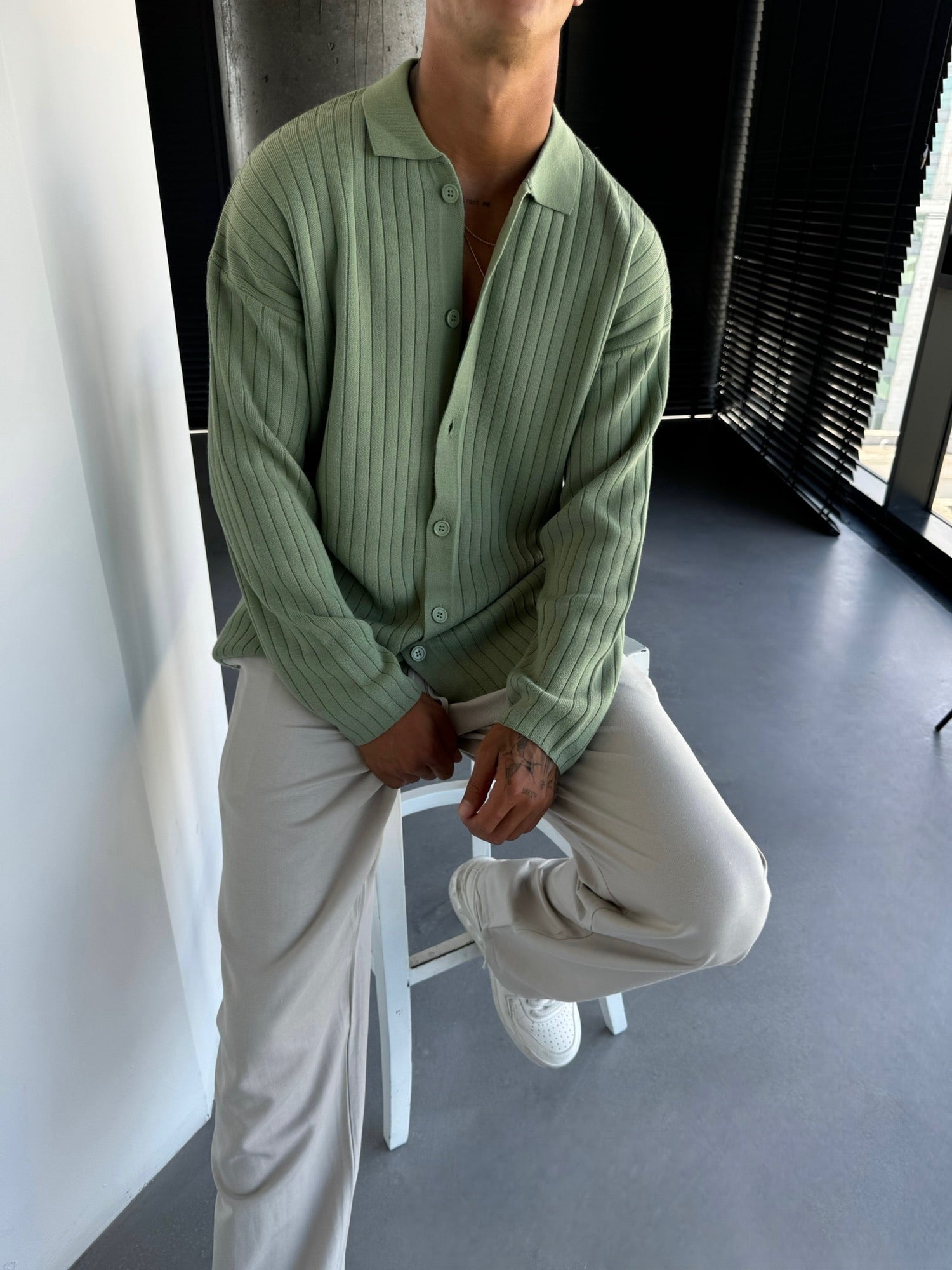 Oversize Wide Ribbed Long Arm Knit Shirt - Grass