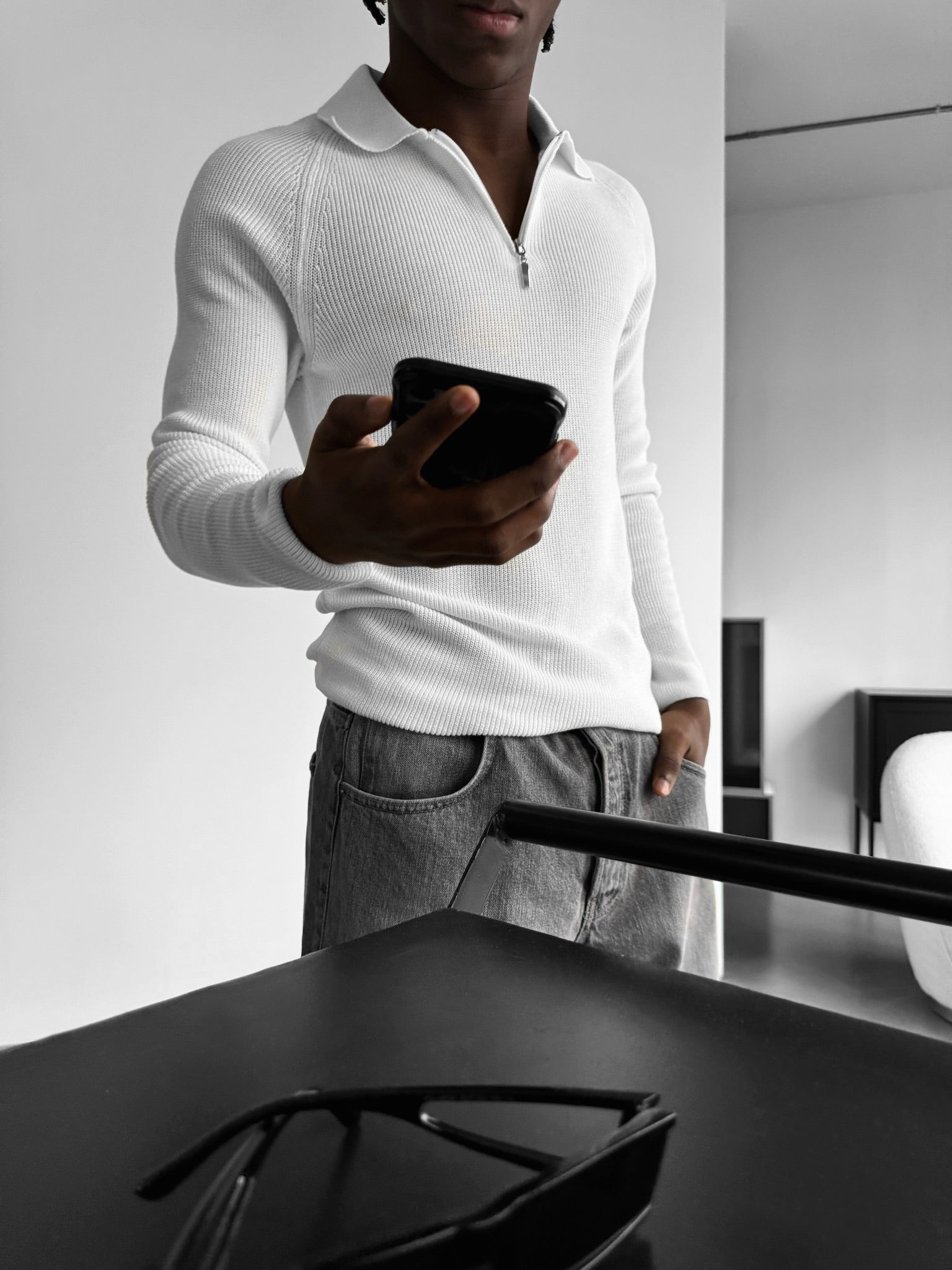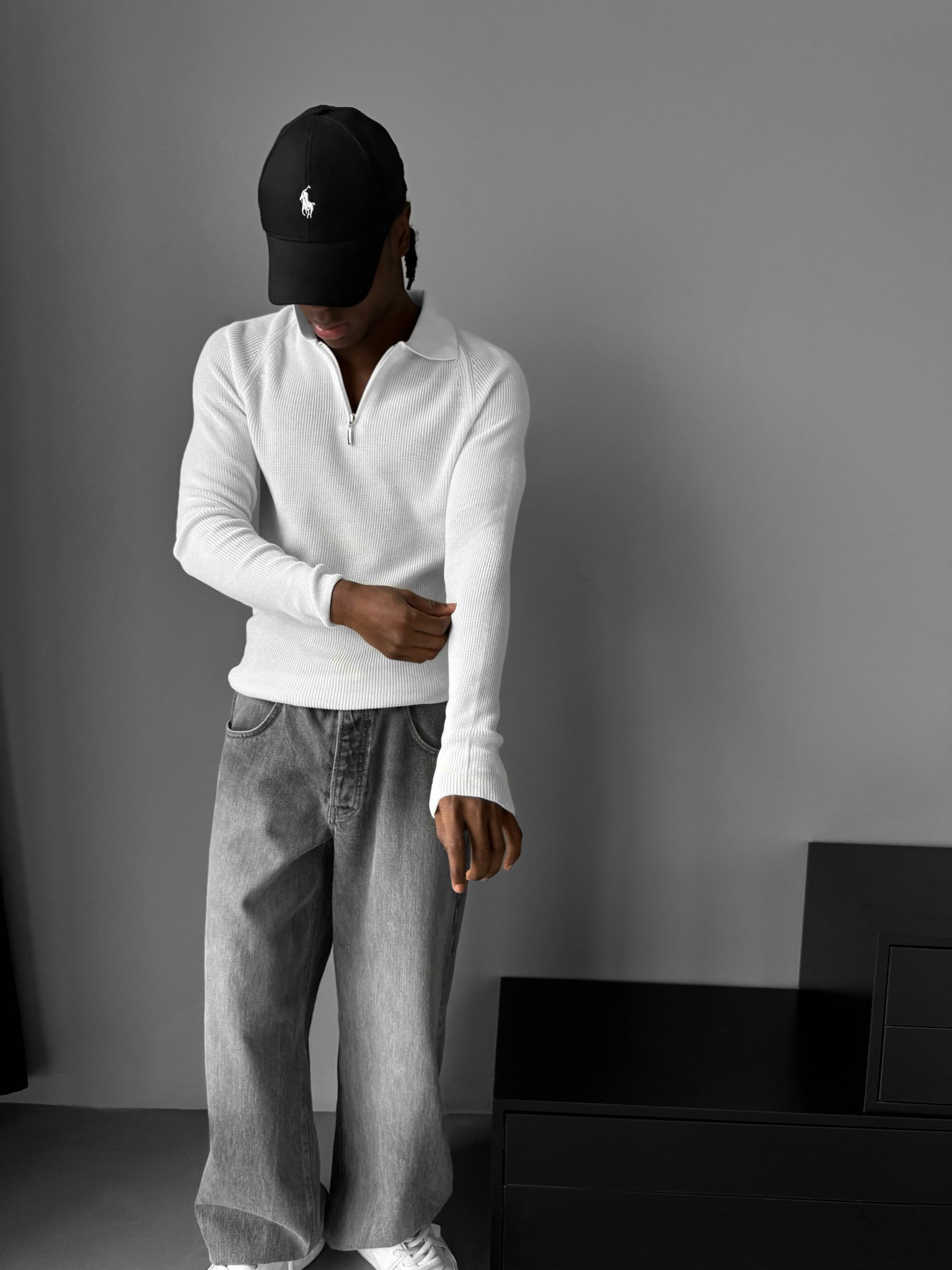 Slim Fit Knit Zipper Polo Sweater - Ecru