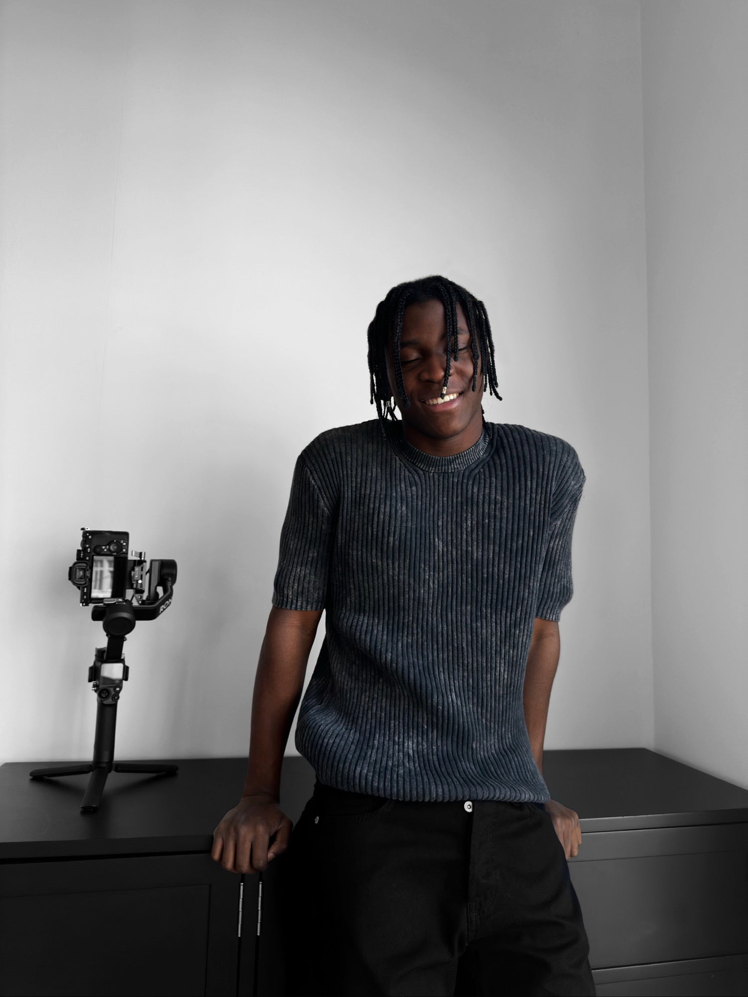 Slim Fit Washed Thin Lines Knit T-Shirt - Anthracite