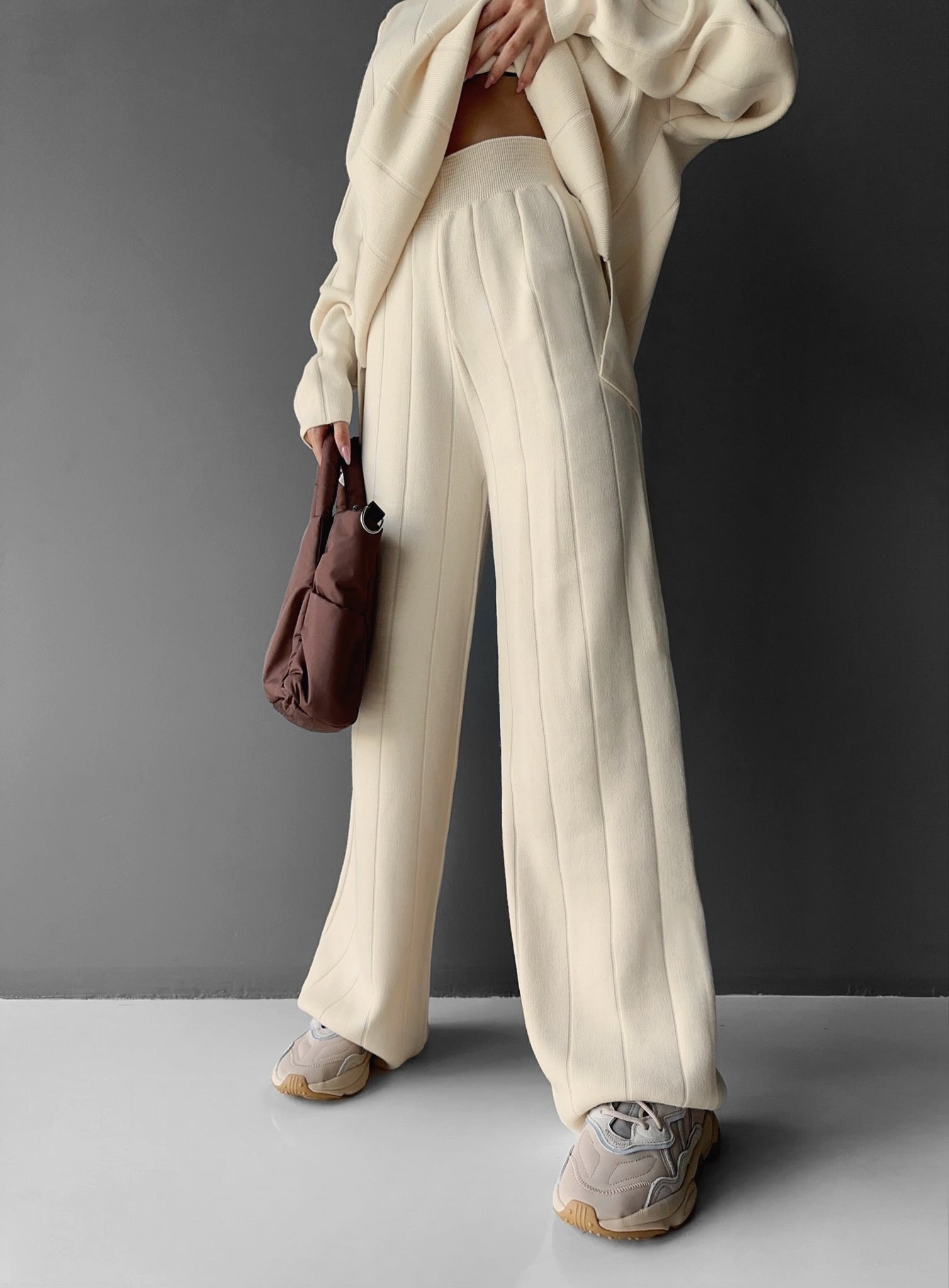 Wide Leg Knit Textured Trousers - Beige