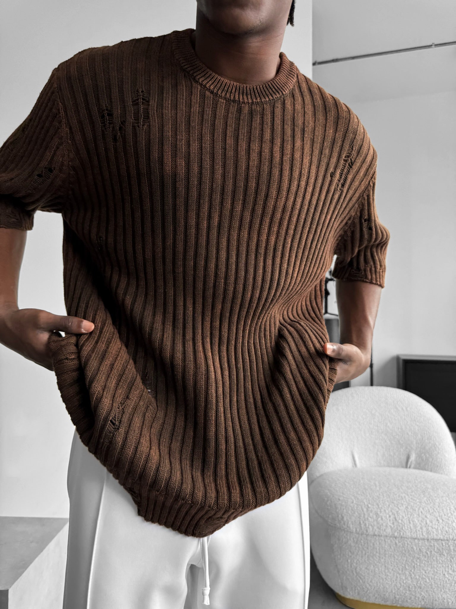 Slim Fit Washed Thin Lines Knit T-Shirt - Brown