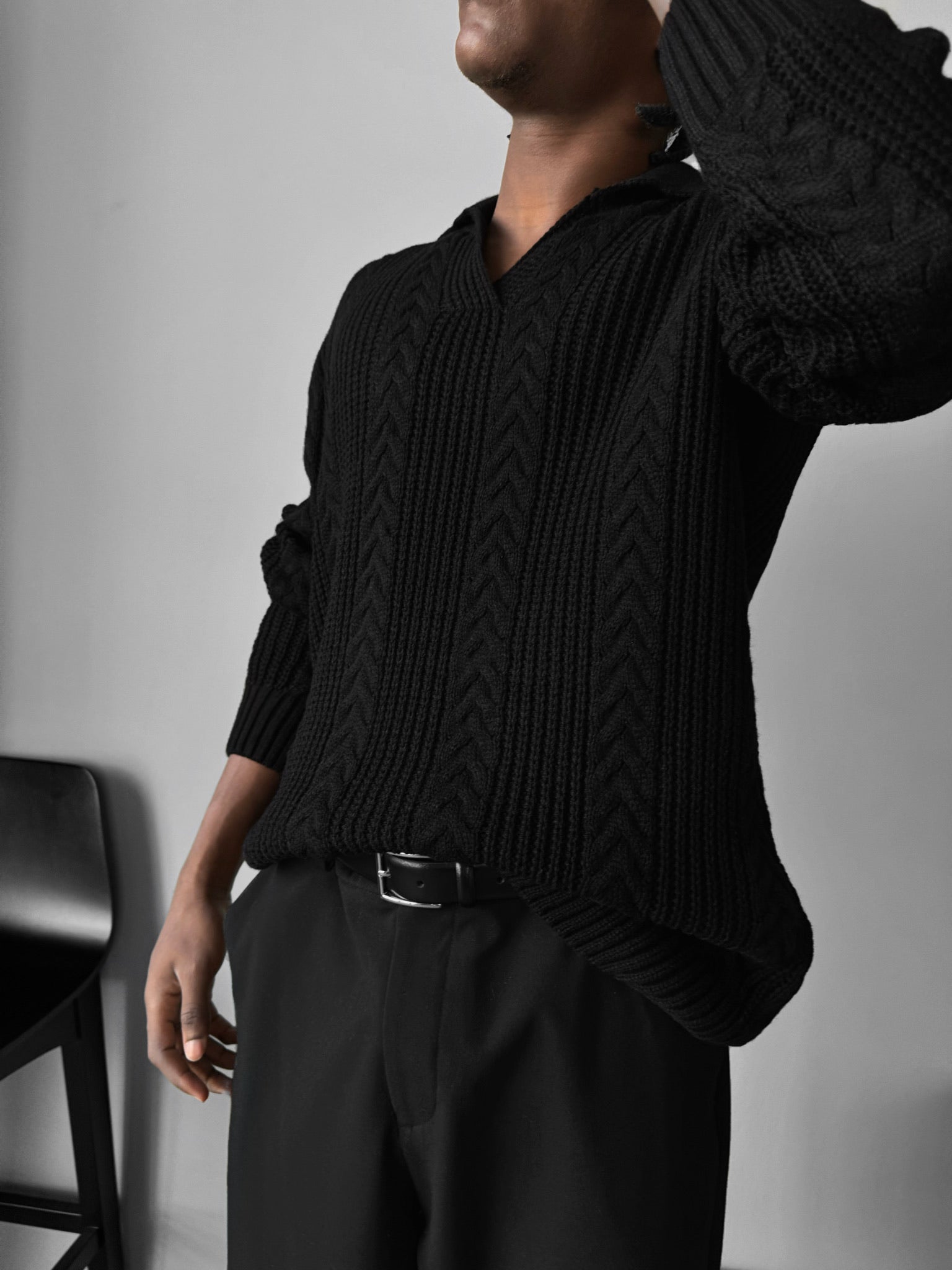 Oversize Braided Structure Polo Sweater - Black