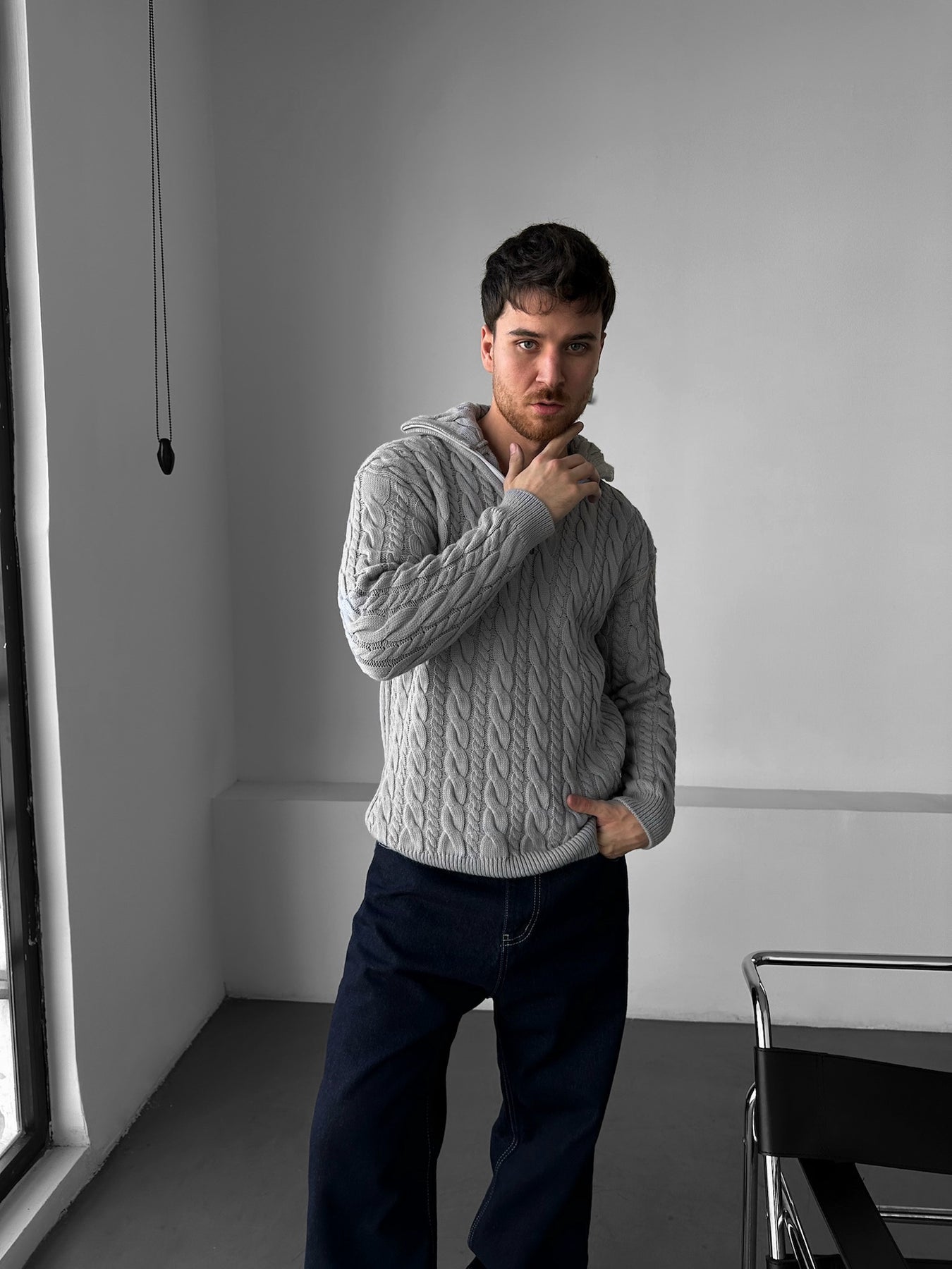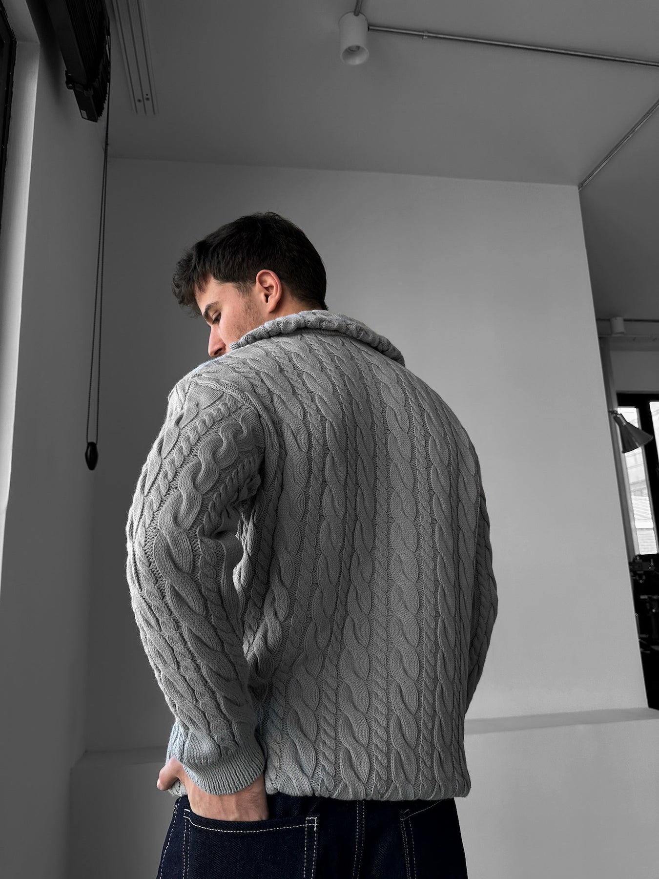 Oversize Collar Braid Zipper Pullover - Grey